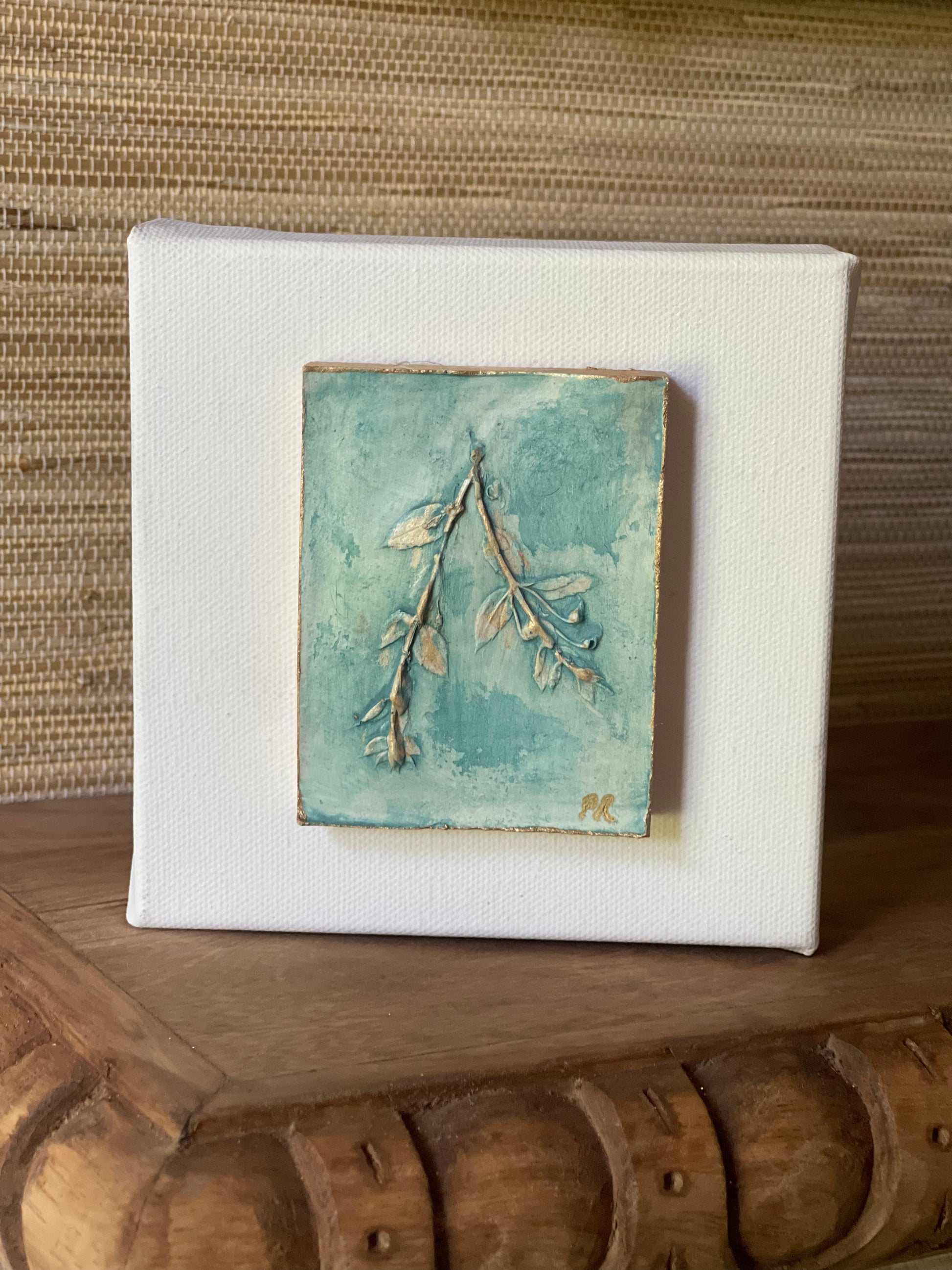 This original piece was created in plaster, using florals from my Delta Mississippi Farm, finished in Delta Blue Watercolor wash and mounted on a 5 x 5 inch canvas. Each piece is signed by the artist.