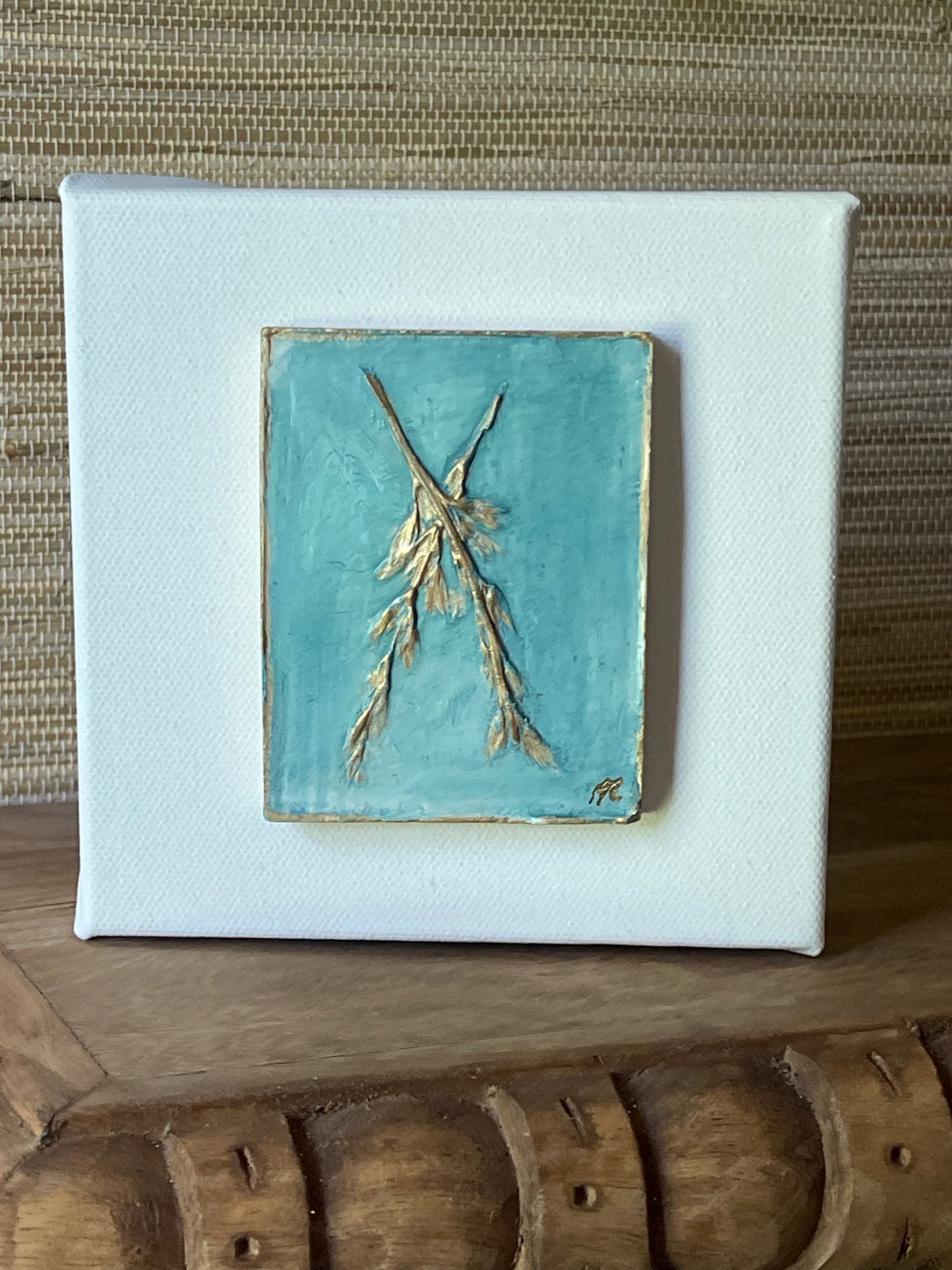 This original plaster piece was created using Corn Tassels from my Sunflower, Mississippi Farm. Each piece has been pressed by hand into clay and surrounded by a form to which plaster is then poured. Once set, the clay is peeled away and the sculpture is revealed. After the plaster has dried, it is then painted by hand in my exclusive Delta Blue Watercolor Wash, and finally burnished in a beautiful gold paint, that brings the detail to life, After painting, it is varnished & finally mounted on a 5 x 5 inch square canvas.