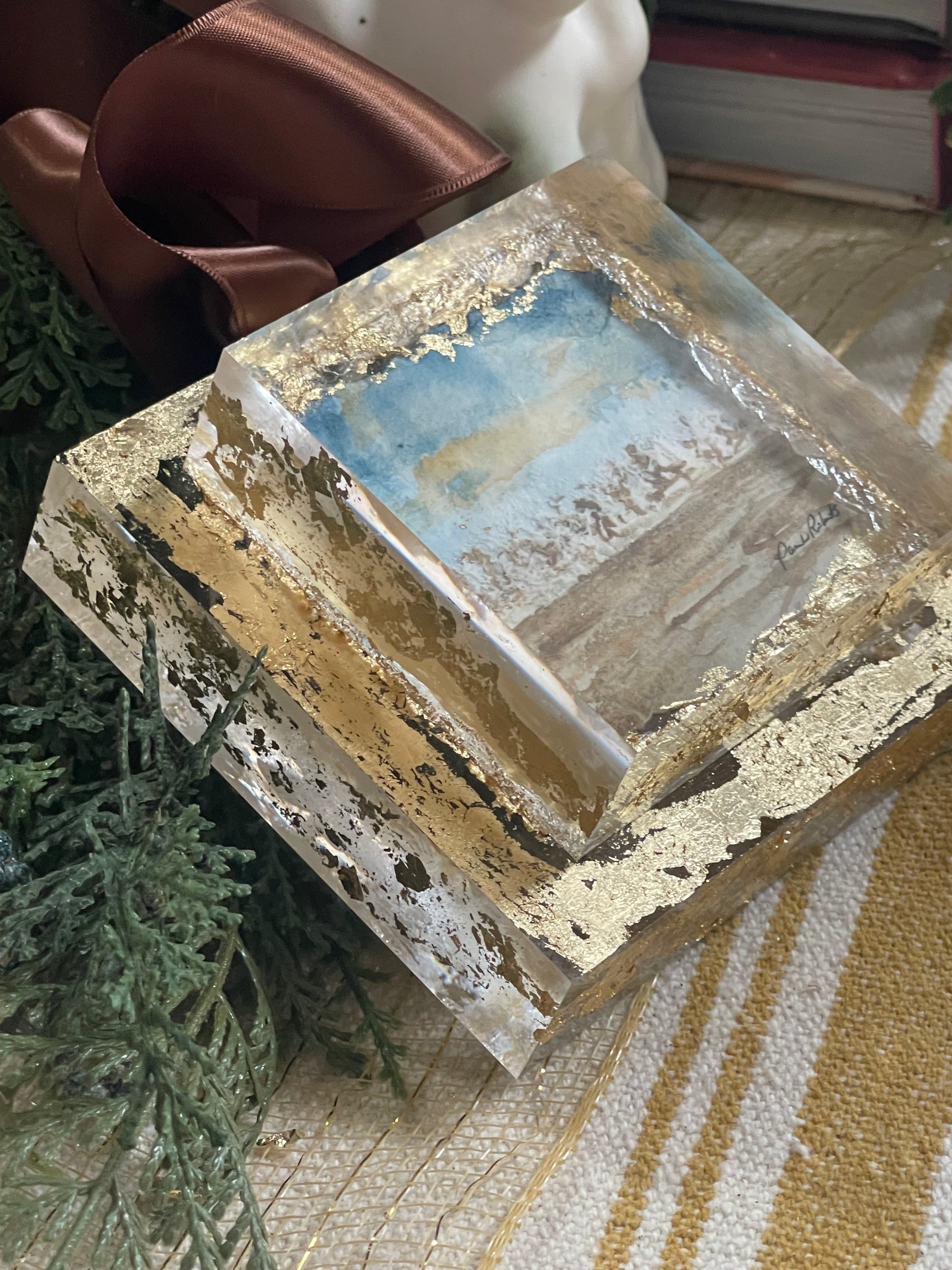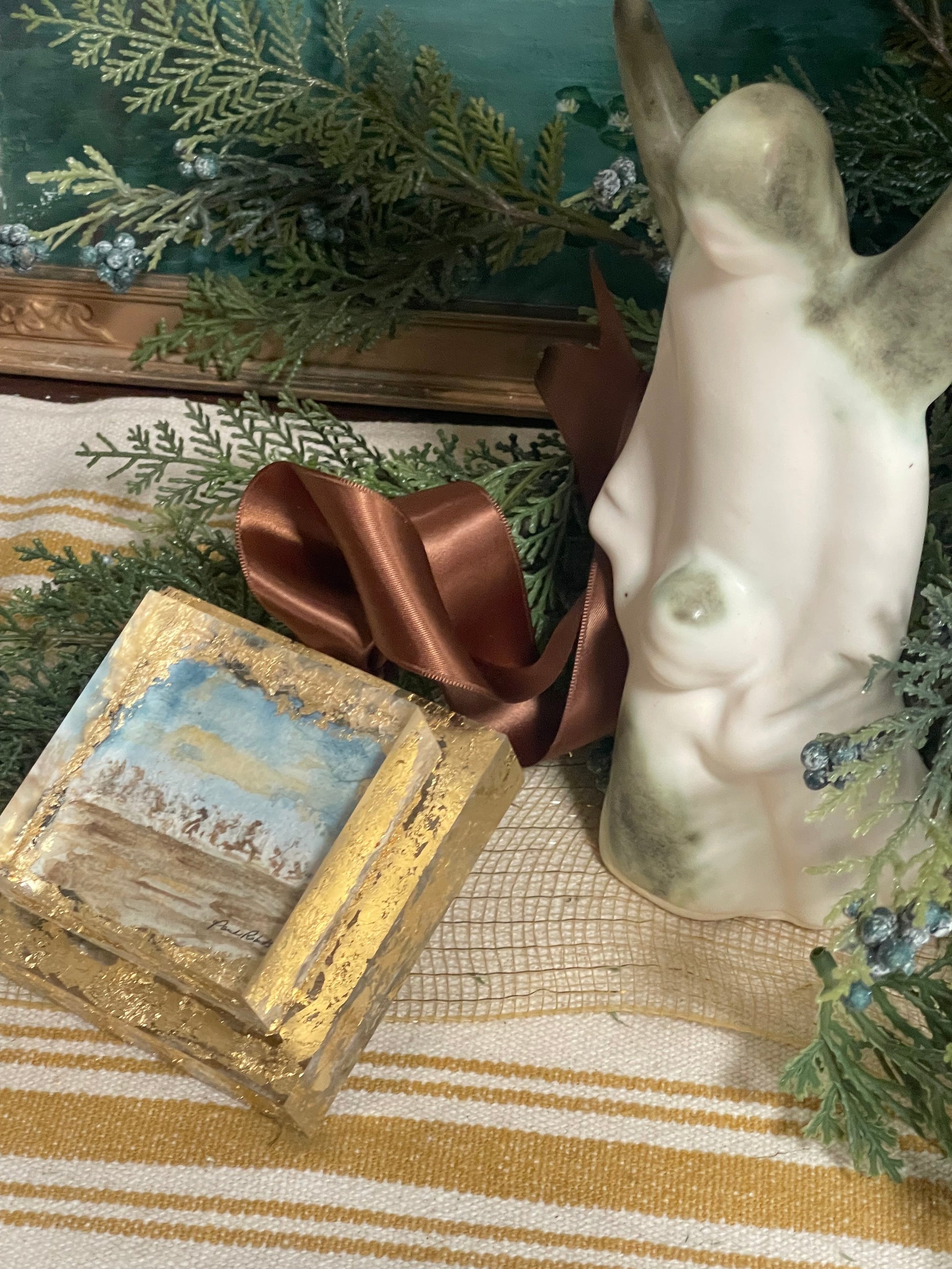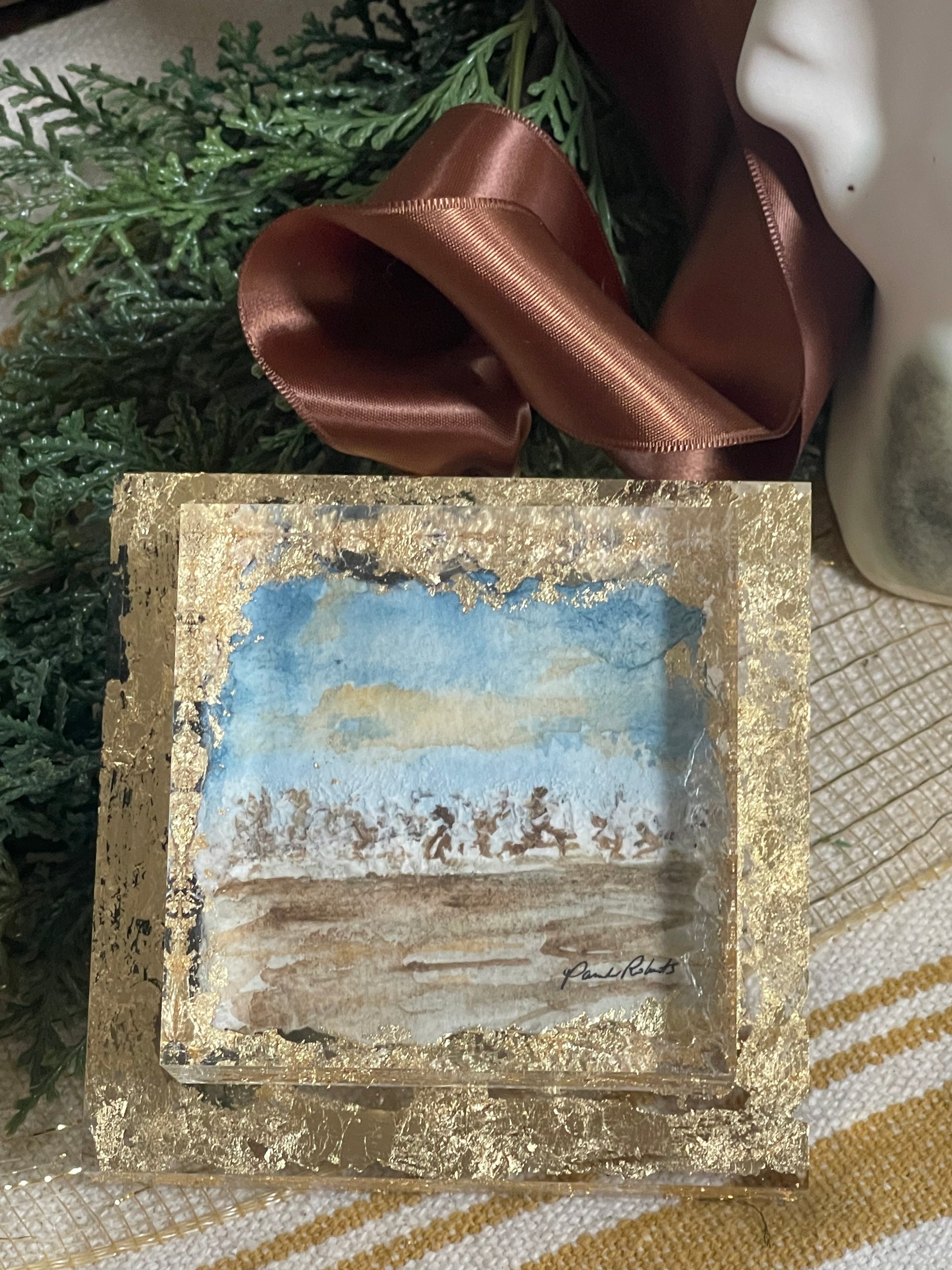 As the day exhales into evening, warm amber sunlight settles gently across the cotton fields, bathing each boll in a quiet, glowing hush. The sky softens to tones of honeyed orange and muted gold, where light lingers just long enough to transform the familiar into something sacred. This watercolor captures that fleeting moment when the Delta rests—when heat, harvest, and horizon meet in stillness—inviting the viewer to pause, breathe, and remember the beauty found in the day’s last light.