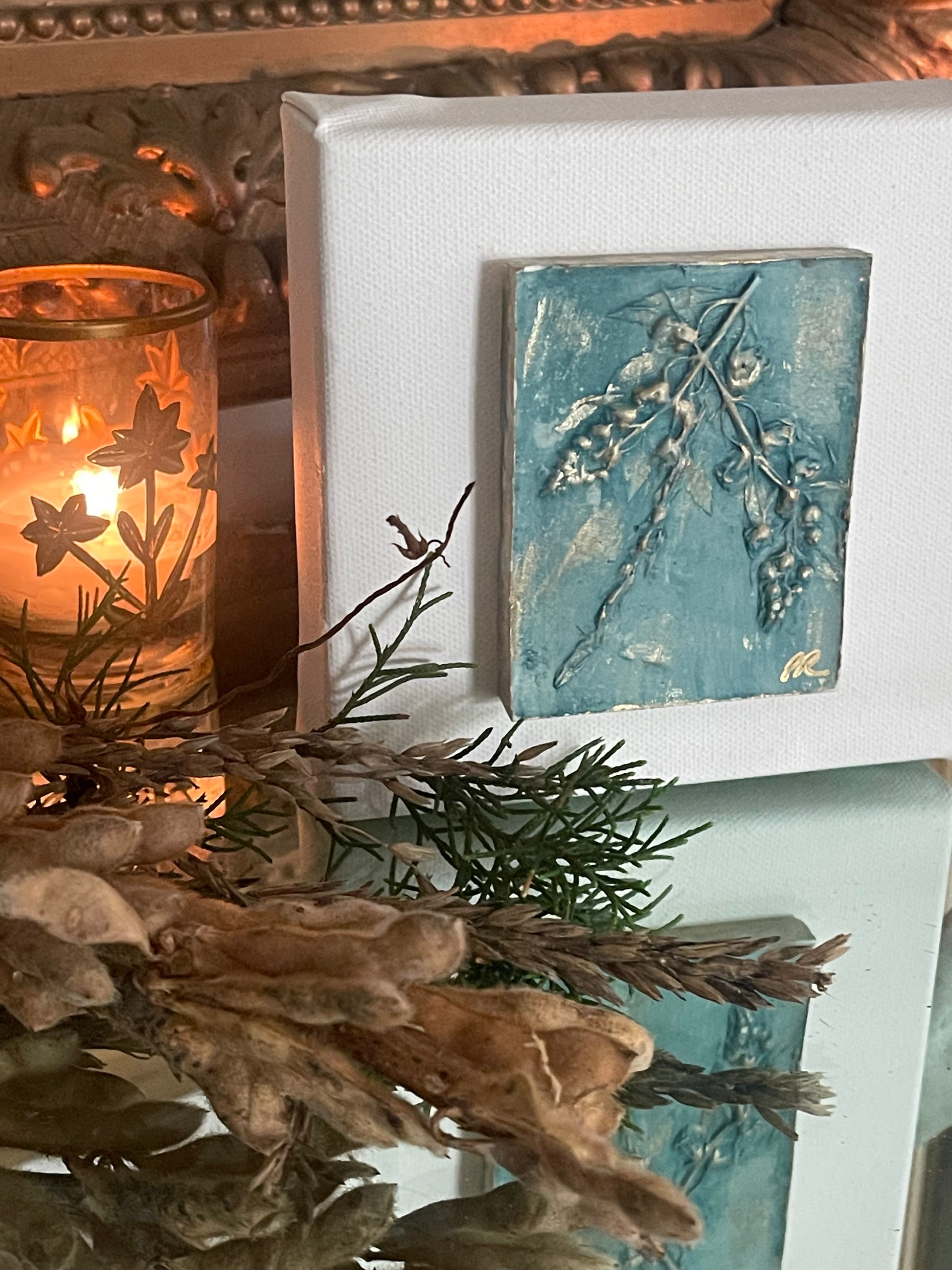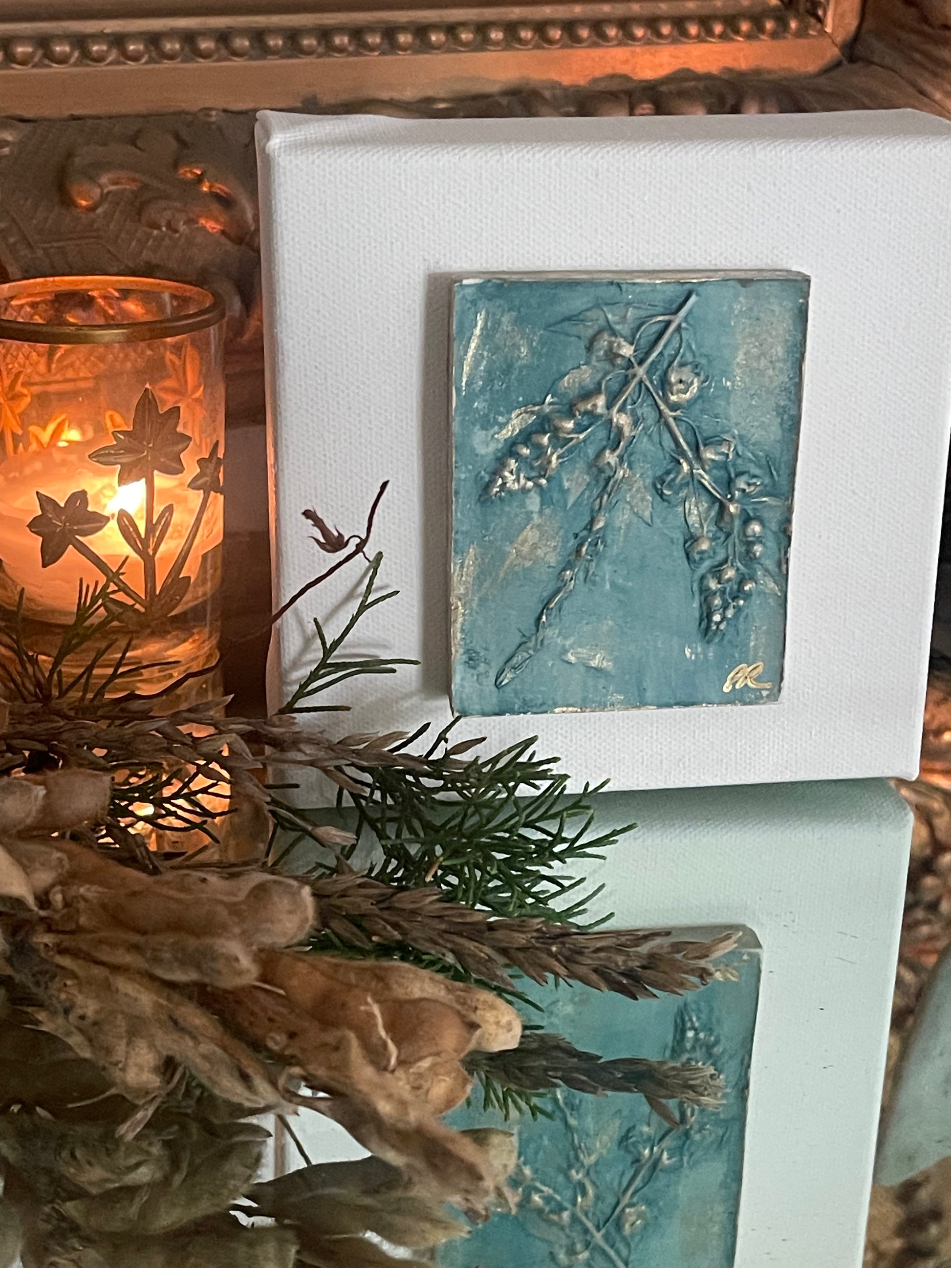 This original piece was created in plaster, using botanicals from my Delta Mississippi Farm. Botanicals are pressed into clay, then a form is created and plaster is poured into the form. After proper drying time, the form is removed and the clay peeled away, to reveal the finished cast. When the piece has dried completely, it is then painted in my Delta Blue Watercolor wash, then burnished in gold, varnished, and finally mounted onto a 5 x 5 inch gallery wrapped canvas. Each piece is signed by the artist.