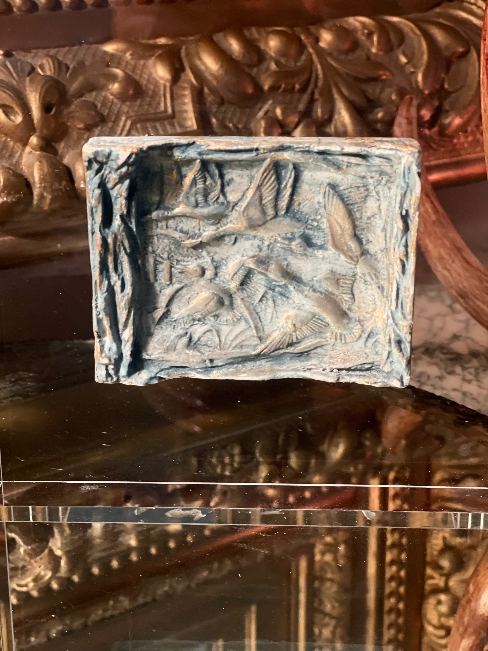 Each plaster bas-relief in the Delta Heritage Collection honors the timeless traditions and landscapes of the Mississippi Delta. The very reason we ended up in the Delta! Hand-cast and finished in small batches at my Sunflower, Mississippi Farm, these works feature sculpted scenes of ducks, geese and loyal hunting dogs - symbols of the region's sporting heritage and enduring connection to the land. This piece has been finished in my Delta Blue Watercolor wash and burnished in gold - then varnished and mounted onto an 6 x 6 x 1 inch acrylic base for a modern feel. These are beautiful on an entry table or mantel - and makes an artful statement piece for those who love the outdoors & share in our hunting heritage.
