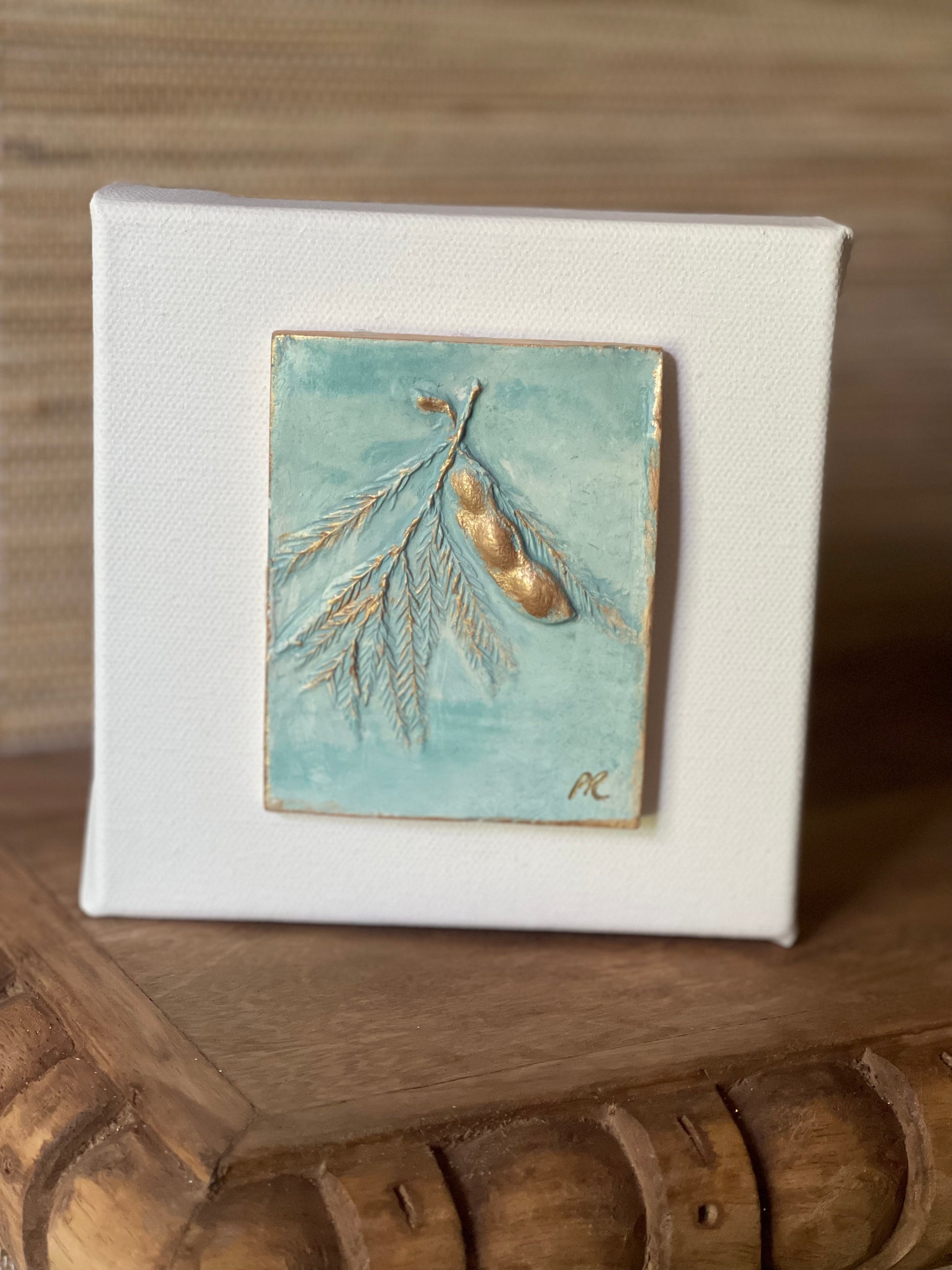 Delta Soybean & Bald Cypress Bas Relief - created in the Delta - finished in Delta Blue Watercolor wash, mounted on 5 x 5 inch canvas. Each piece is signed by artist.