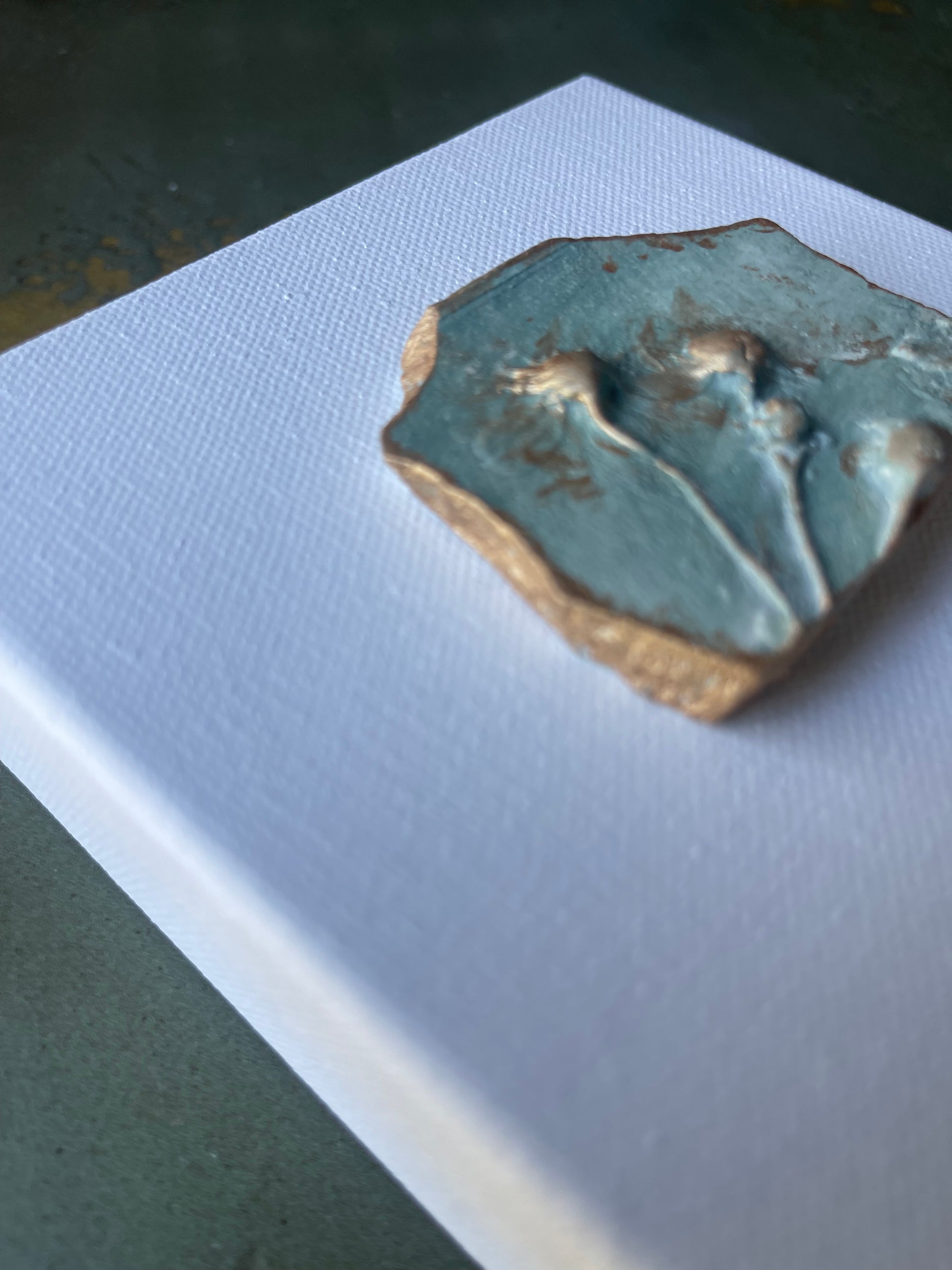A fragment of a botanical bas-relief created using wildflowers gathered from the Delta fields. Each bloom was pressed into clay before casting, preserving its delicate form in plaster. The piece is finished in a soft blue wash with gold edges, evoking the shimmer of morning light across the fields.