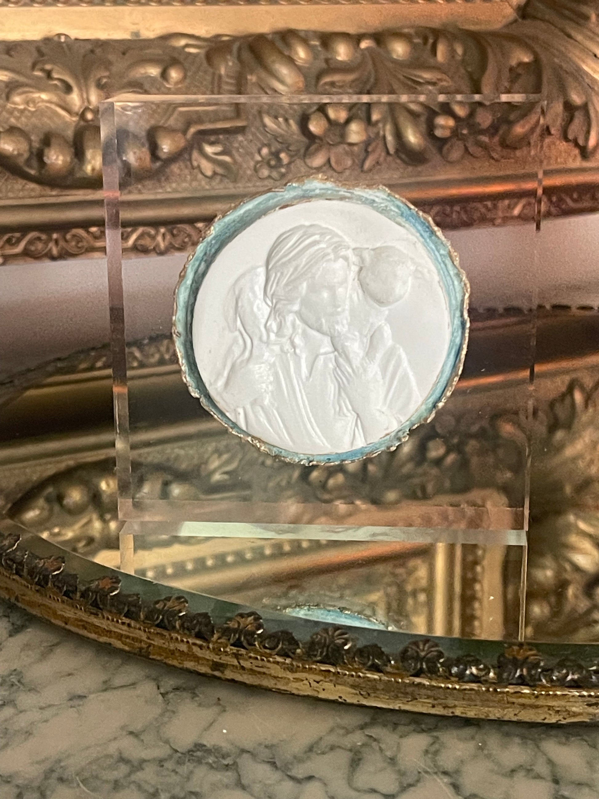Mounted on a clear 4x4x1-inch acrylic base, the design reflects light softly beneath the pure white plaster, giving the image a feeling of quiet holiness — as if lifted by grace itself.