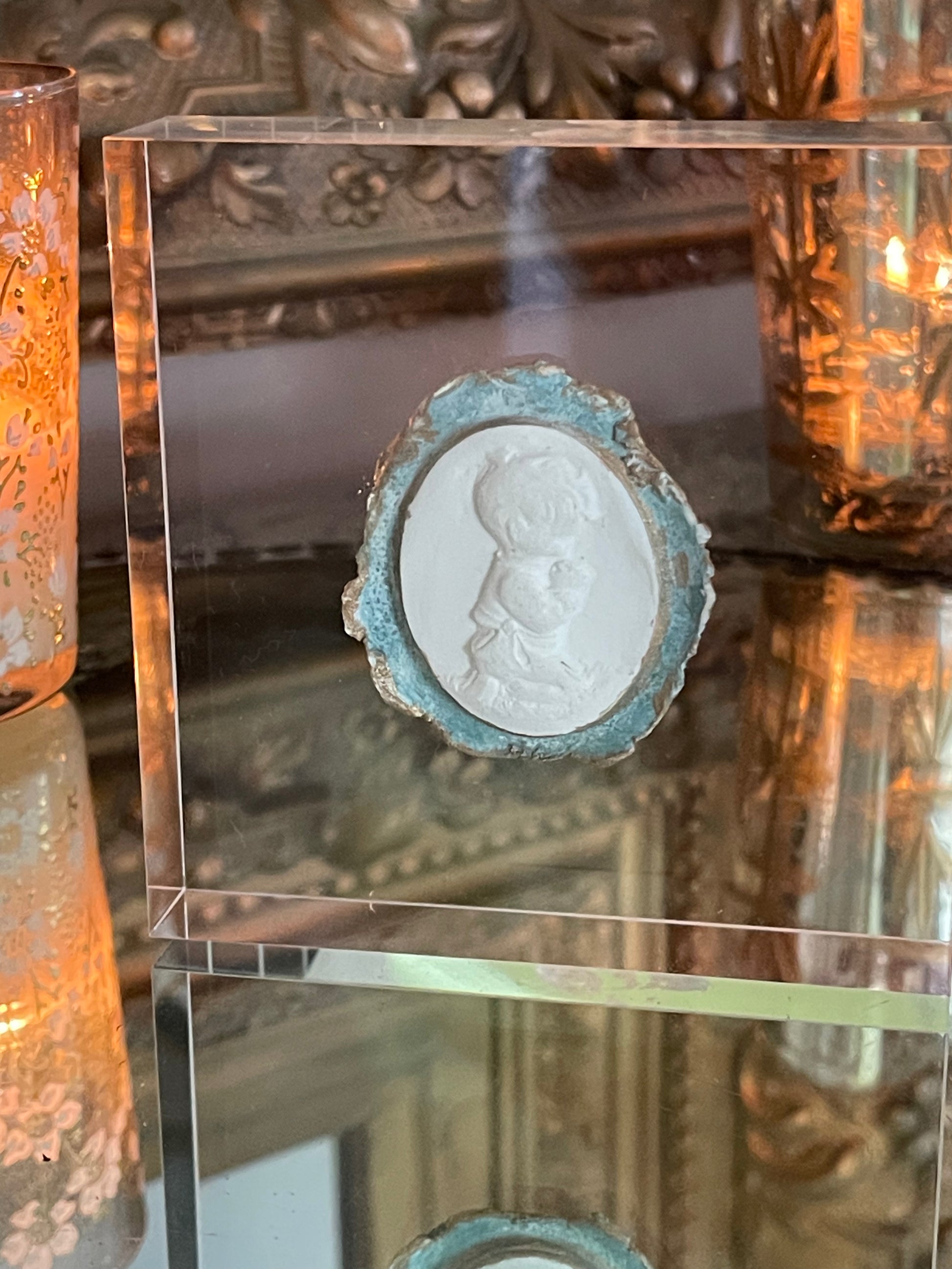 Praying boy, created in plaster and finished with a deckled edge. Each piece is finished with my Delta Blue Watercolor Wash and touches of gold , and mounted on a 4 x 4 x 1 acrylic block. This piece is perfect for gifting for a new mom , baby shower or a birthday keepsake. These are also the perfect gift for grandmas!