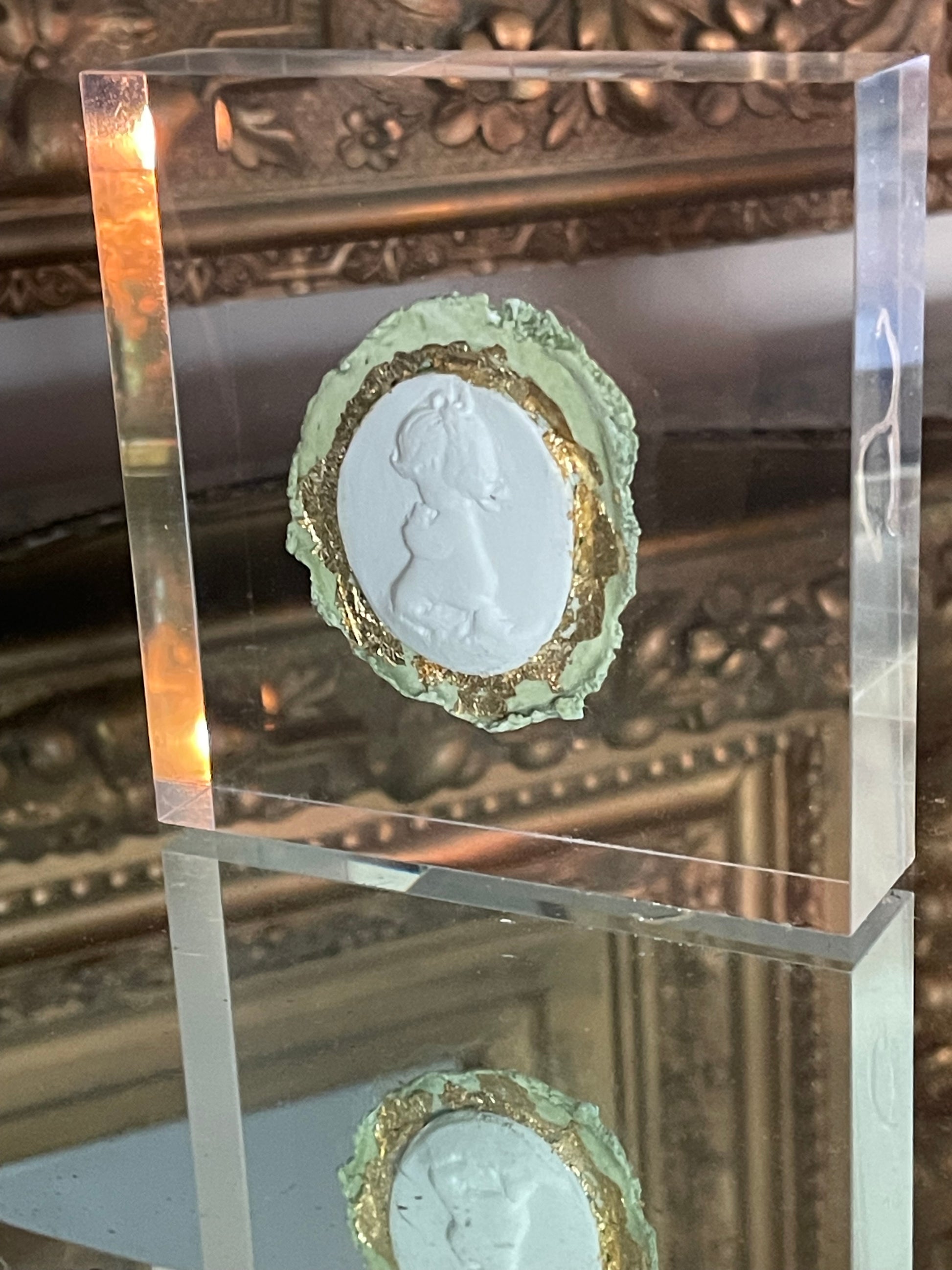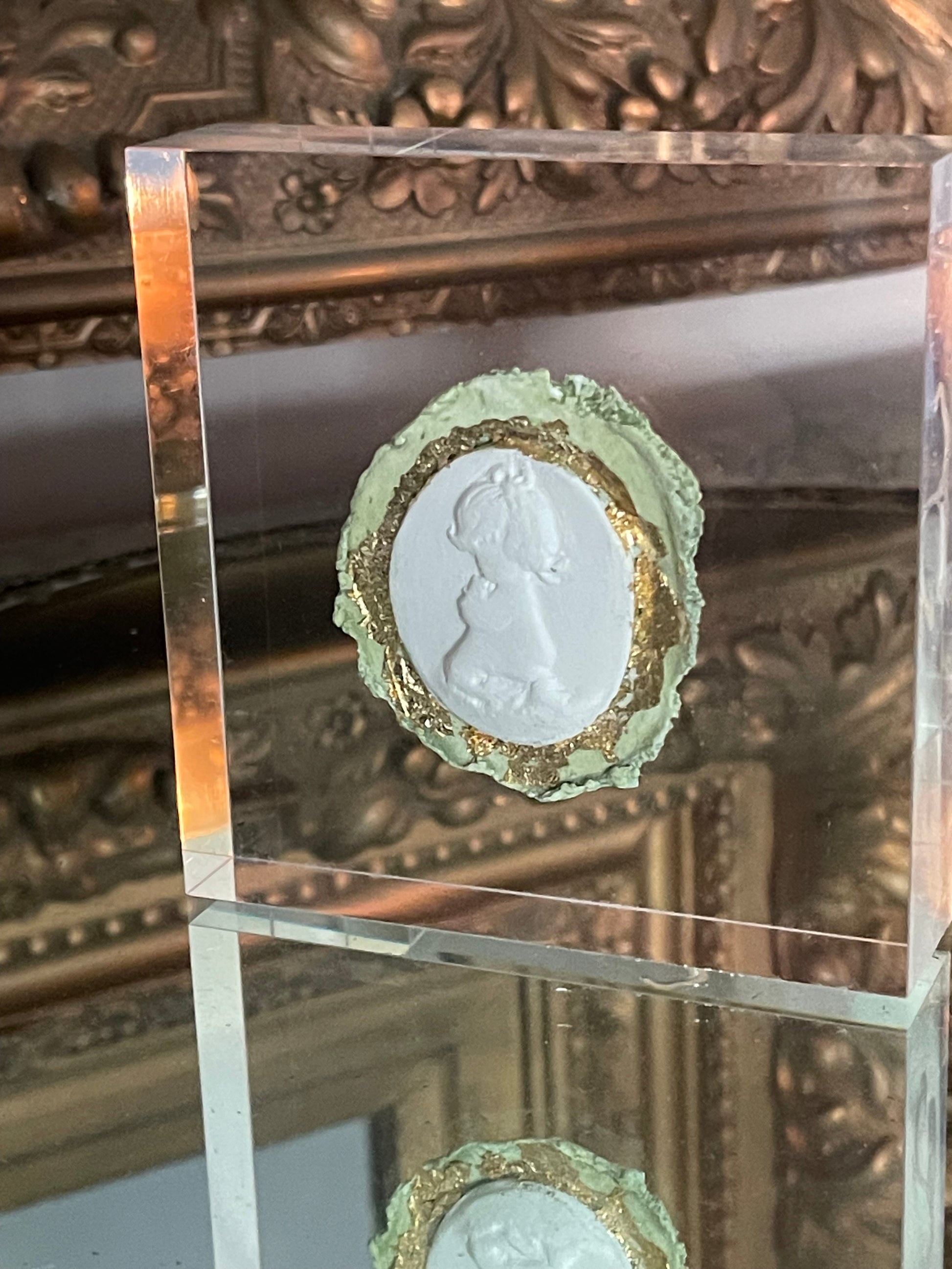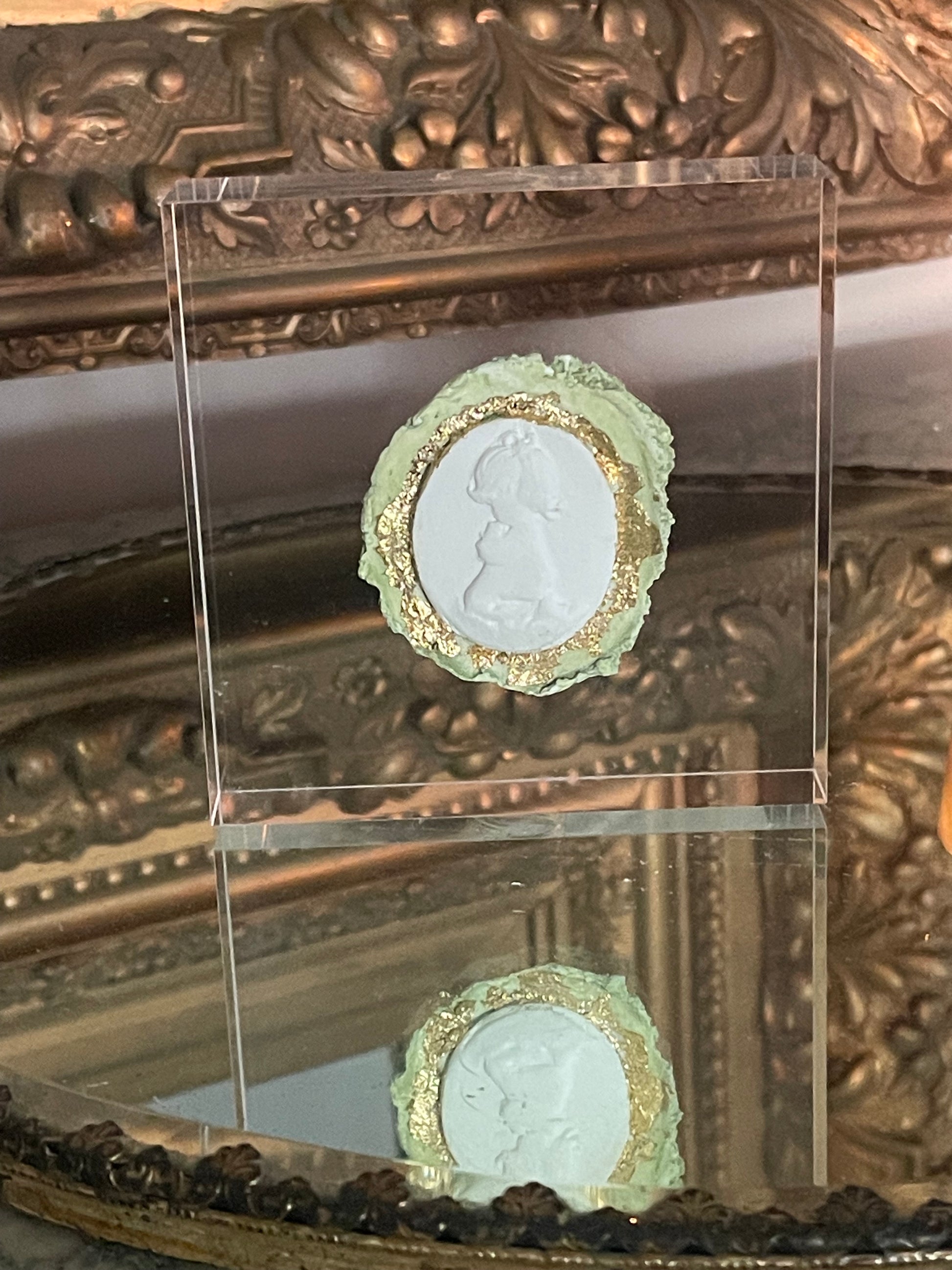 Mounted on a 4x4x1 acrylic base, this piece is gently painted in my signature green watercolor wash, allowing the contours of the plaster to glow through with soft depth and dimension.