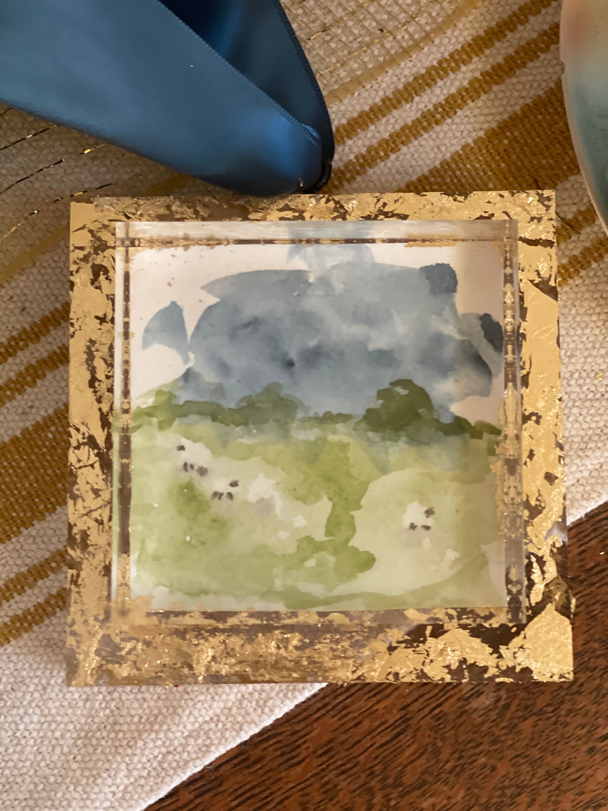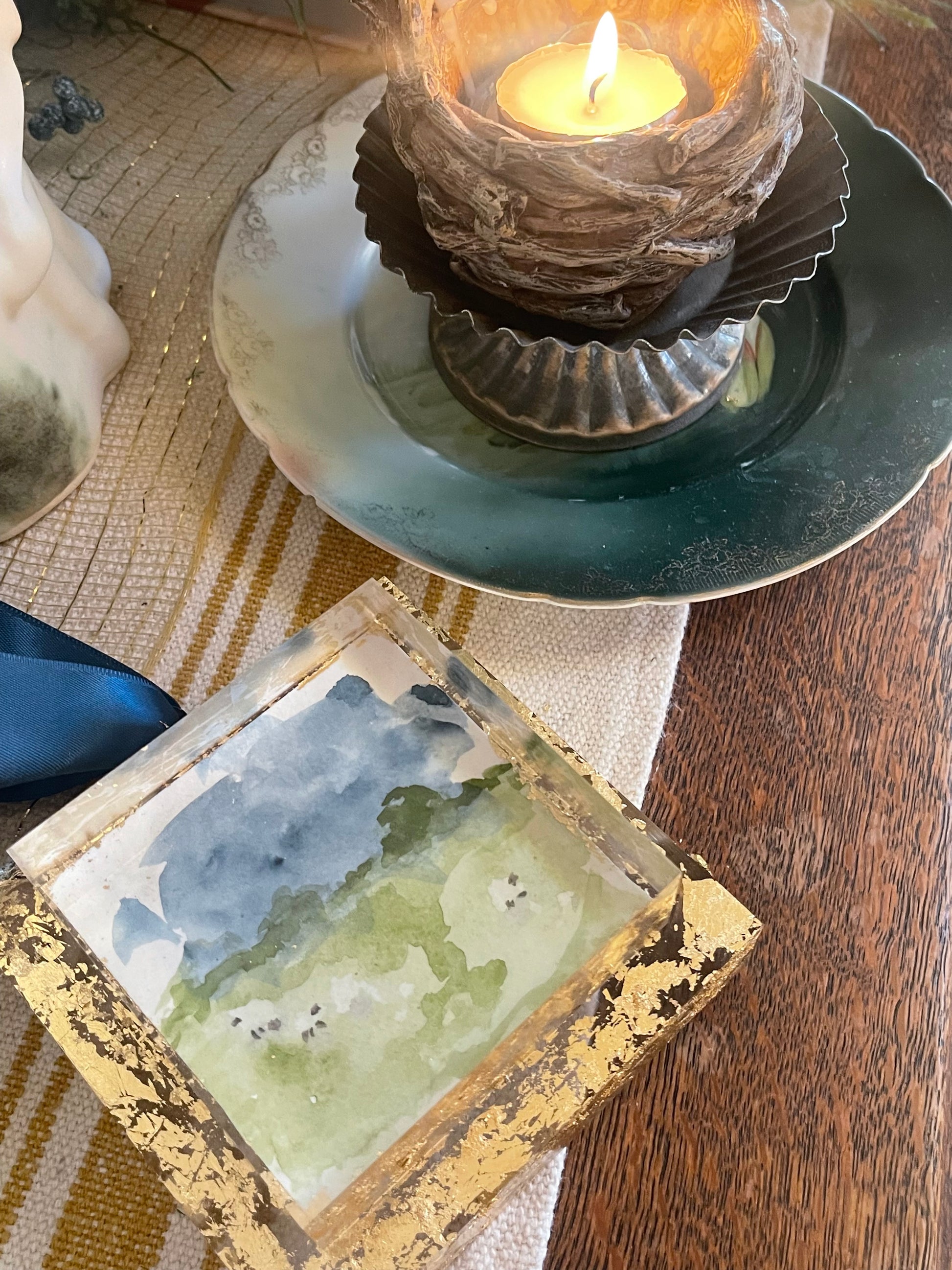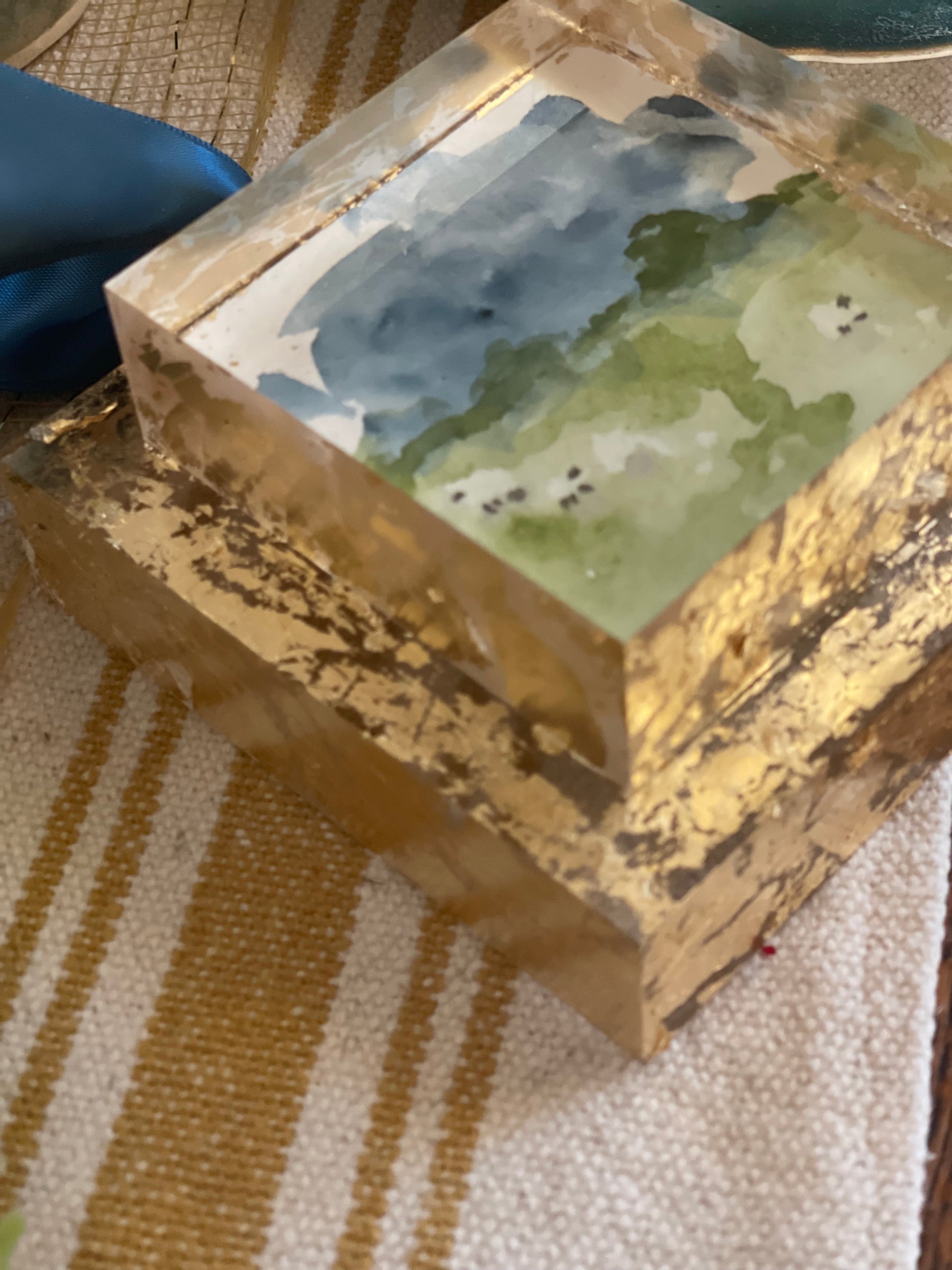 The painting is mounted on a clear acrylic base and hand-finished with gold leaf, applied with an intentionally organic touch. Rather than strict perfection, the gold is left softly varied to add texture, warmth, and depth—allowing the surface to catch the light in a way that honors the beauty of the handmade.