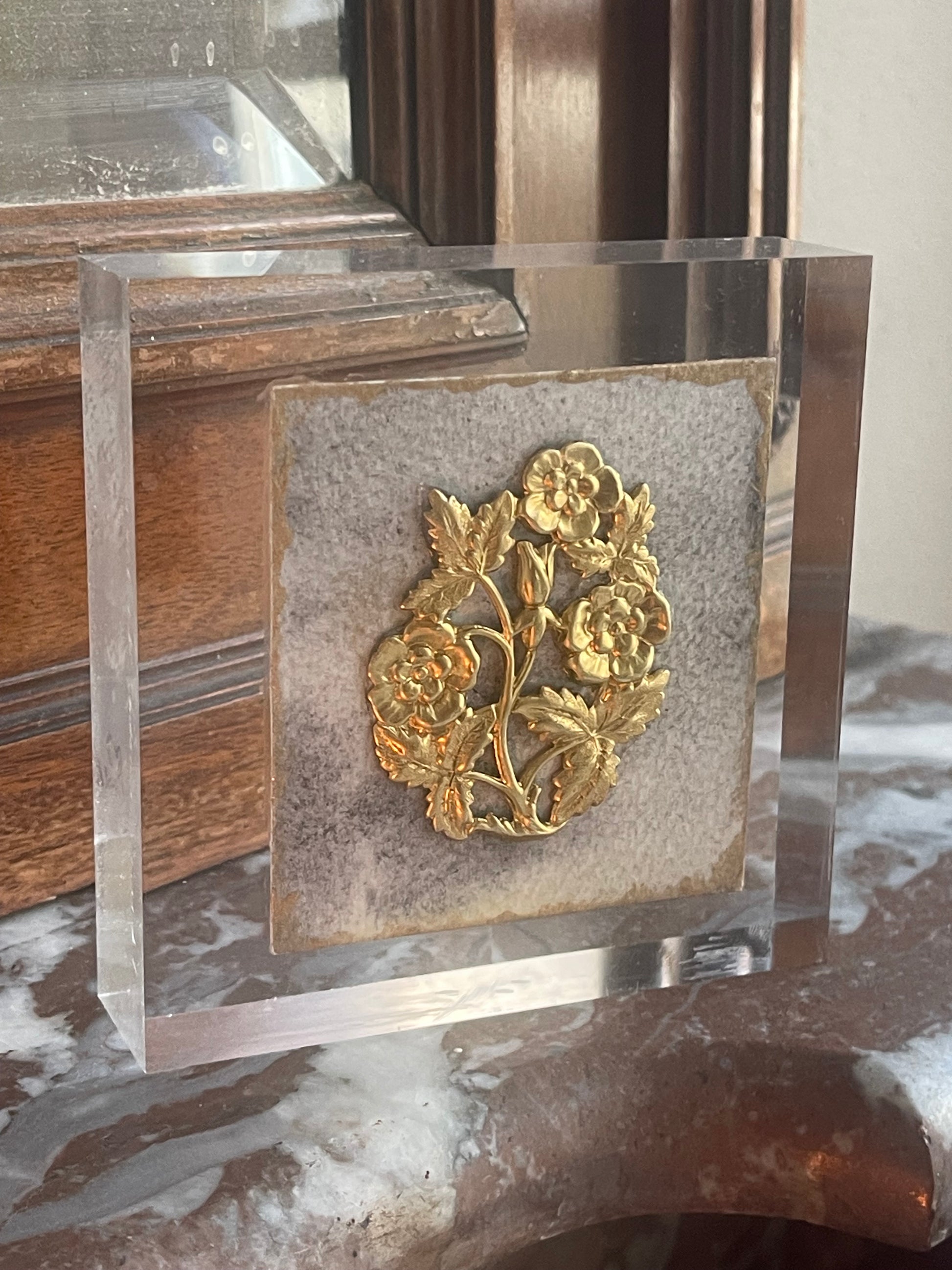 From our River Delta Bloom Collection - a hand stamped brass flower bouquet, finished with an elegant grey watercolor background & gold edges - mounted on a 4 x 4x 1 in acrylic base.