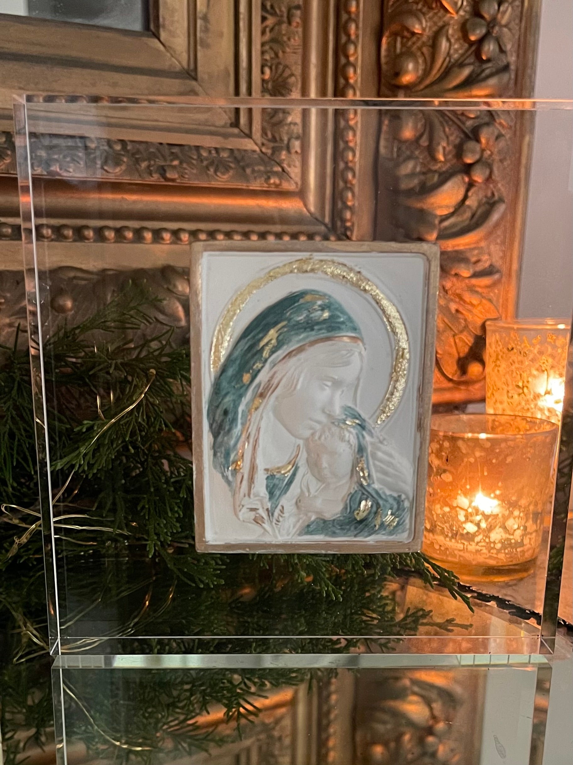 This hand-cast plaster bas-relief portrays the Madonna and Child in a moment of quiet tenderness — a sacred connection between mother and child. Each piece is individually crafted, painted in a soft ivory and Delta-green wash, and adorned with hand-applied gold leaf that catches the light through the clear acrylic mount. Mounted on a 6x6x1 acrylic base, it reflects a warm, modern luminosity while preserving the timeless spirit of devotion.