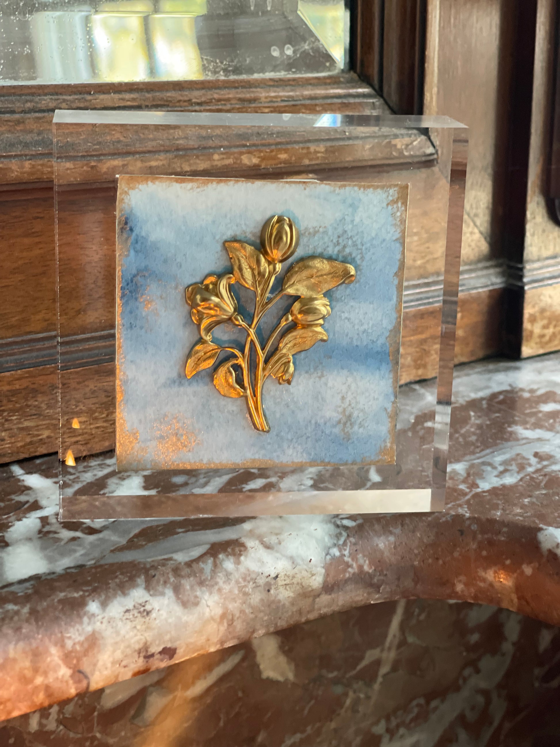 Hand stamped brass flowers, finished with an elegant watercolor background & gold edges - mounted on a 4 x 4x 1 in acrylic base. Shown in Delta Blue Watercolor wash.