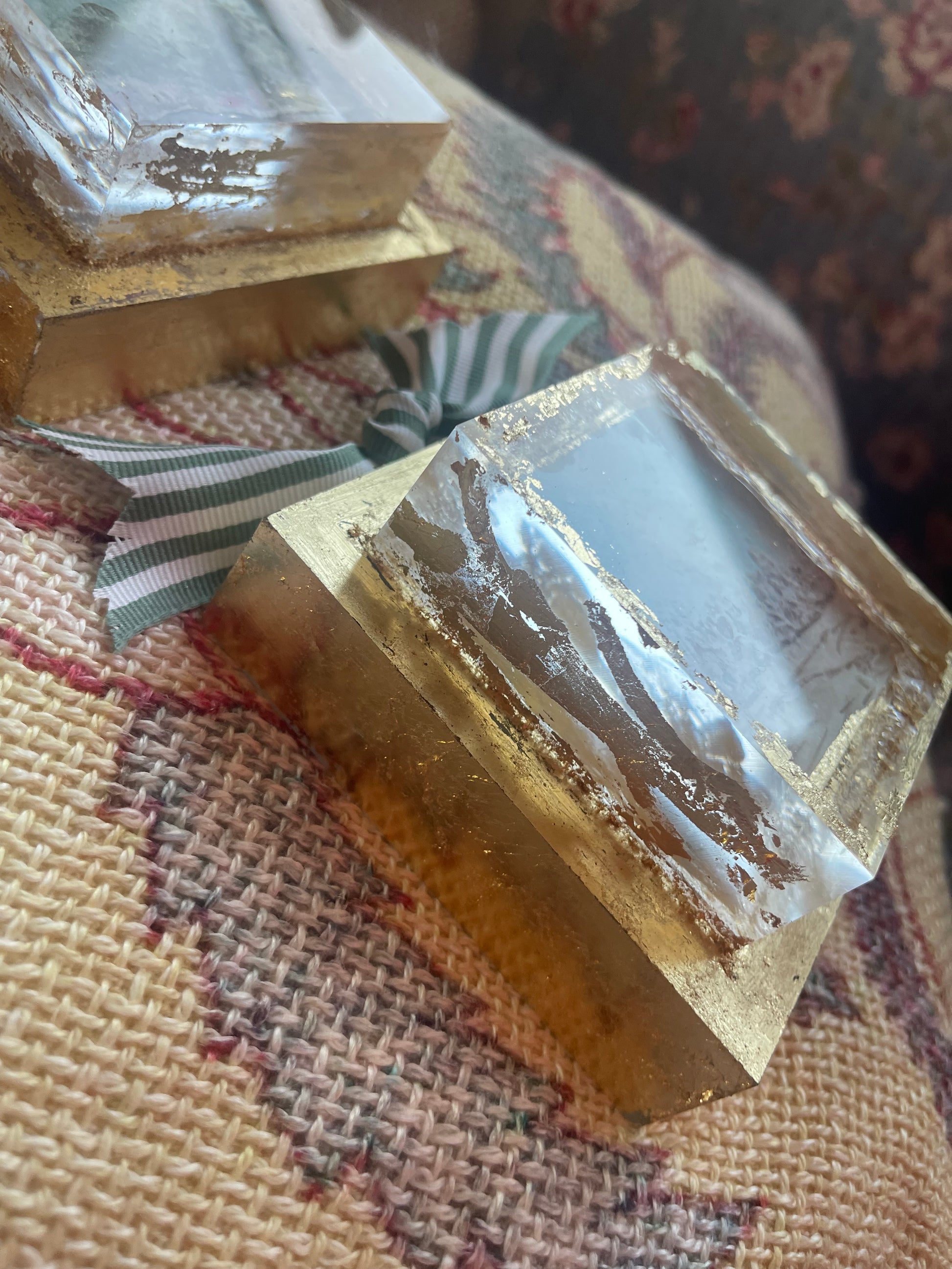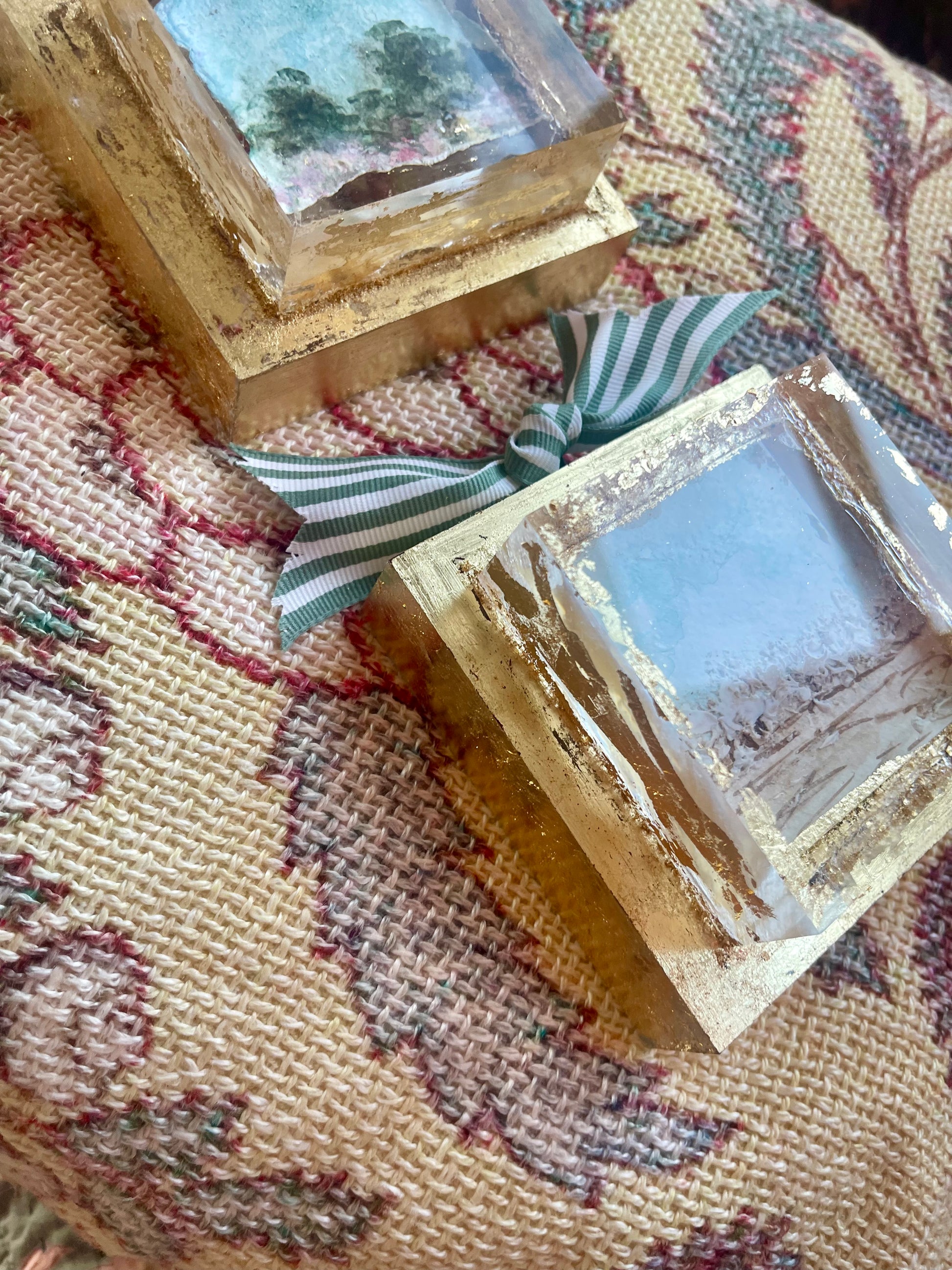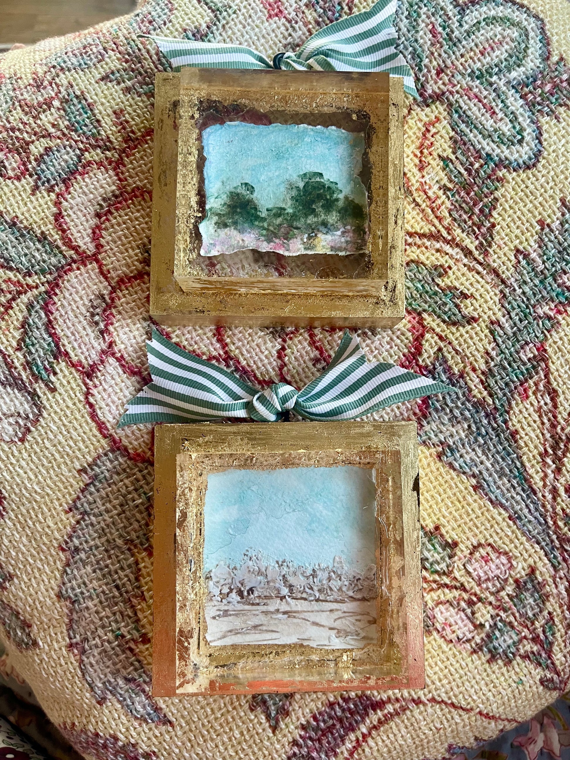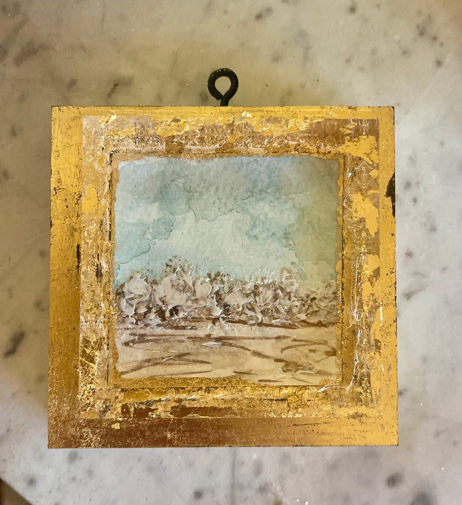 The painting features a hand-torn deckled edge and is mounted on clear acrylic hand-brushed with gold for a luxe finish. The hand-applied gold leaf is intentionally left organic, allowing subtle texture and natural variation that catch the light and celebrate the handcrafted nature of the piece. A ribbon and hook attached at the top complete the artwork, making it ready to hang upon arrival.